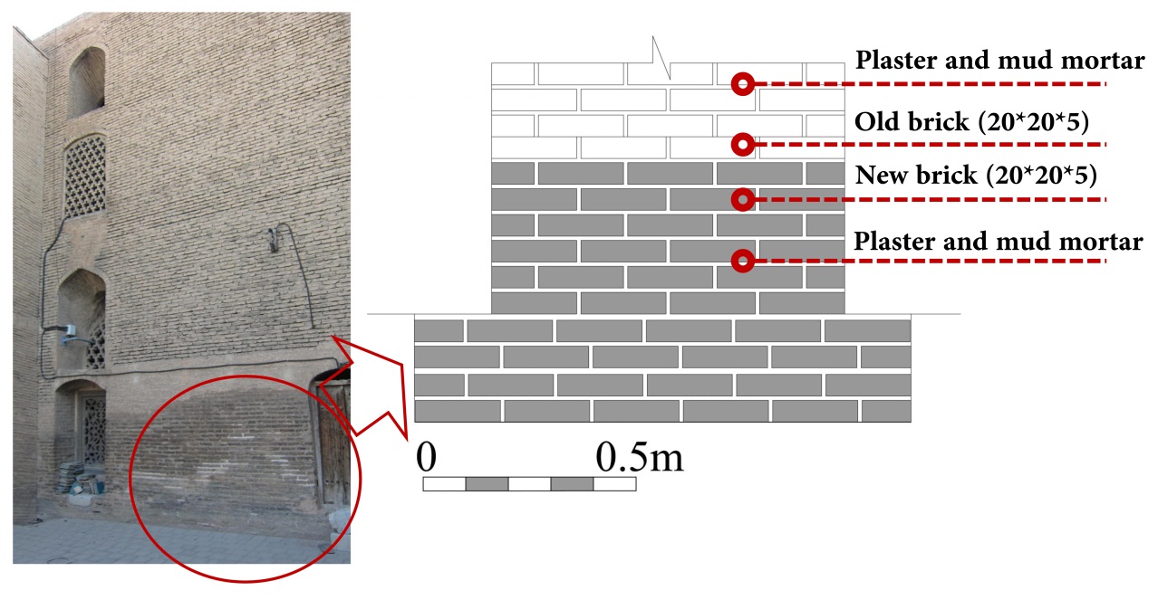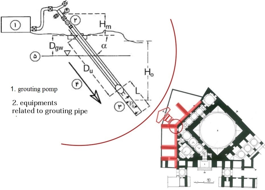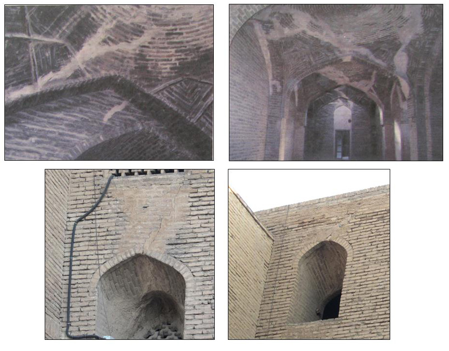 Sheikh Lotfollah Mosque is one of the important mosques in Isfahan located on the east side of Naghshejahan Square. The mosque was built from 1602 to 1606 A.D. by Mohammad Reza Isfahani. The structural balance was damaged after the destruction of the school behind the mosque and later the existing bathroom and Turkish closet. Afterwards, in 1934-1938, the project to construct the buttresses began, due to the thrust movement in the north and north-west side of the mosque. Currently, deformation and movement can be observed, despite the presence of these buttresses which are examined in this research using field studies, a careful examination of the buttresses and vulnerability analysis in the area according to library studies. The results of this study verify the presence of ascending moisture caused by leakage of water and sewage pipes in the area as the main reasons for this damage. Therefore, replacement of pipes, foundation grouting and organizing the area are among the restoration project requirements.