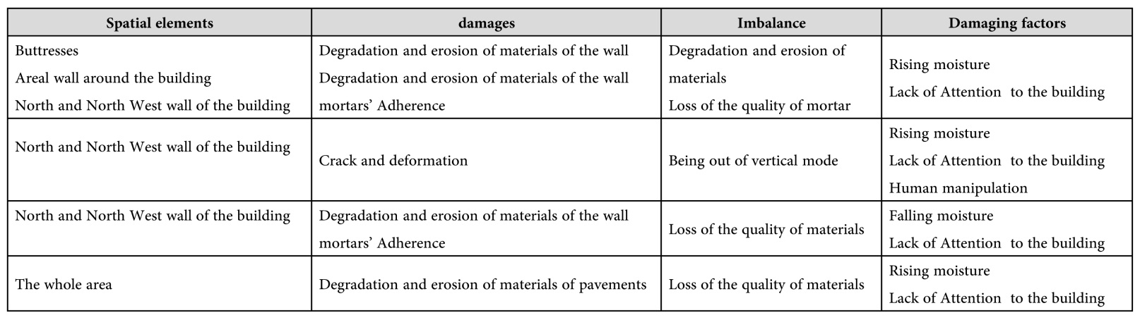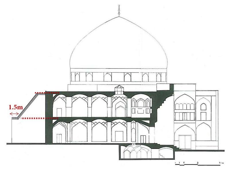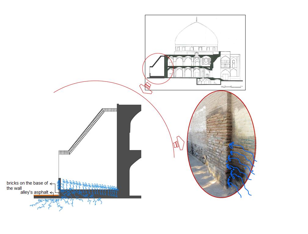 Sheikh Lotfollah Mosque is one of the important mosques in Isfahan located on the east side of Naghshejahan Square. The mosque was built from 1602 to 1606 A.D. by Mohammad Reza Isfahani. The structural balance was damaged after the destruction of the school behind the mosque and later the existing bathroom and Turkish closet. Afterwards, in 1934-1938, the project to construct the buttresses began, due to the thrust movement in the north and north-west side of the mosque. Currently, deformation and movement can be observed, despite the presence of these buttresses which are examined in this research using field studies, a careful examination of the buttresses and vulnerability analysis in the area according to library studies. The results of this study verify the presence of ascending moisture caused by leakage of water and sewage pipes in the area as the main reasons for this damage. Therefore, replacement of pipes, foundation grouting and organizing the area are among the restoration project requirements.